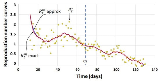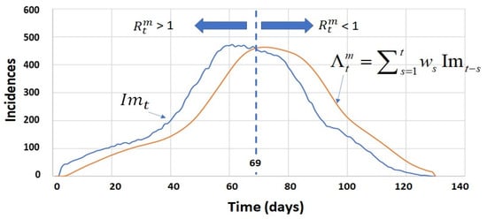 is the ratio of with respect to the effective number of infectious individuals in the past. In simple words, it means is the number of secondary cases caused by an infected individual. This is a very important concept. As the summation in (9) is something we cannot handle, because all the incidences are in the past, and the factors represent a natural law, we should act on the factor, which represents some elements that can be controlled by us (for example, population education, sanitary and governmental process, quarantines, and so forth), even if there are some other elements that cannot be handled directly (such as weather conditions). Thus, through our actions, we should try to reduce as much as possible; to reduce the number of incidences, must be less than 1.