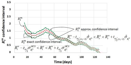 Equation (A30) alone is sufficient to statistically describe , but unfortunately, in the calculus of confidence intervals, it results in the computational processes that need to be run for each instant t taking a long time to be completed. Therefore, instead of using (A30) we prefer to use a subrogate probability density function such as the Gamma distribution. In Figure A5, we compare the limits of the 95% confidence interval obtained by applying the exact function (A30) and a surrogated Gamma distribution with means and standard deviation given by (A28) and (A29), respectively. The data of the series of incidence are the same as those used in the paper.