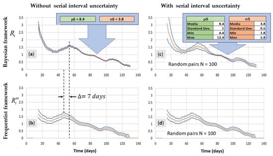 Equation (25) specifically is the instantaneous reproduction number confidence interval without uncertainty in the serial interval, because there is another type of confidence interval which considers serial interval uncertainty [16]. This means, although the serial interval is still considered to have stable values in theory, it could be impossible to obtain serial interval data to calculate the factors. This could happen, for example, at the beginning of an epidemic. This condition can be handled by modeling the uncertainty in the serial interval parameters [16], which are the mean (μS) and the standard deviation (σS). It is assumed that these parameters are random independent normal distributed variables, which they really are not. We follow the same procedure of the Monte Carlo simulation, but instead of changing , we changed μS and σS simultaneously. To emphasize that μS and σS will be considered as random variables, they will be replaced by ms and ss, respectively. Thus: