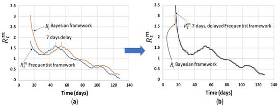 Many have contributed to calculating the effective reproduction number in the modalities identified by Fraser [12], and we briefly review them here. First, as a departure study, we have the work of Fine [14]. He completed a detailed study of the time and place of the infection events, including the time elapsed between infection events of successive individuals, in a chain of transmission, the transmission interval. Wallinga and Teunis [13] developed a method to calculate the case reproduction number. Svensson [15] proposed a mathematical model that characterized the serial interval and generation times, clarifying the differences between these two concepts. The generation times were measured from the time individual A was infected, until the moment that an individual B was infected by individual A. On the other hand, the serial interval is measured from the time individual A presented symptoms, until the time that an individual B, infected by individual A, exhibited symptoms. Fraser [12] deduced a method to calculate the instantaneous reproduction number, mentioned above. Cori et al. [16] proposed another method to calculate the instantaneous reproduction number (), by assuming that the distribution of infectivity (or serial interval) was independent of the calendar time [16], considering that the incidence in the observation time t follows a Poissonian distribution, with a mean given by With this, following a Bayesian analysis framework, the and the corresponding confidence interval were calculated. Thomson et al. [17] developed a proposal that moved away from the assumption of an invariant serial interval with the time, and from the assumption of local transmission of the infections, maintaining the assumption of the Poissonian distribution of the incidences. In this context, the Bayesian model has been adopted by several researchers [18,19].