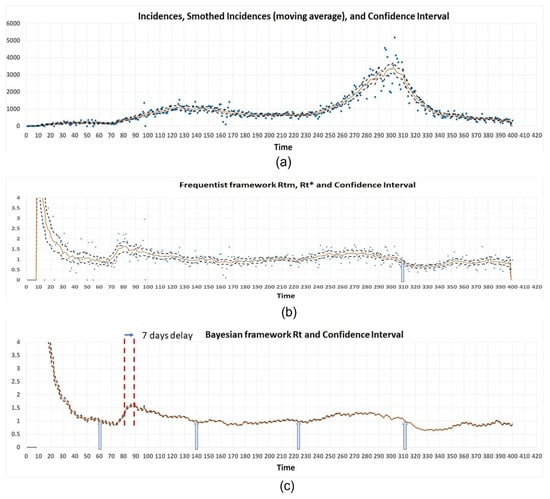The number of infections that occur in an epidemic is associated with the number of cases in the past [5]. This observation has led to mathematical models to explain the evolution of epidemics [6]. Usually, these models propose methods to calculate a frequently used epidemiological indicator, the instantaneous reproduction number , which is the average number of secondary cases caused by an infected individual [1,7]. As this indicator comes from incidence (cases per day) data with a lot of variability, we should not take decisions based on the value alone, because it will be affected by this instability. The statisticians dealt with this problem by conceiving the confidence interval, which is a range of values where it is probable to find the true mean (the in our case). Therefore, to take an informed decision we should take care of both the (a sample mean) and its confidence interval. To date, the current methods to calculate the had consistent results between them [8]. Thus, our main concern is the confidence interval because, when it is calculated by current methods, there is an accepted practice of considering only the Poisson process of the incidences, discarding other kinds of variability (registry errors, delayed tasks, counting errors, etc.). Unfortunately, this practice produces too narrow confidence intervals for the . A narrow confidence interval could be interpreted as positive at first glance; however, in this case, the people responsible for making the decisions are not going to have the complete information available. This is the problem that we are proposing to solve.