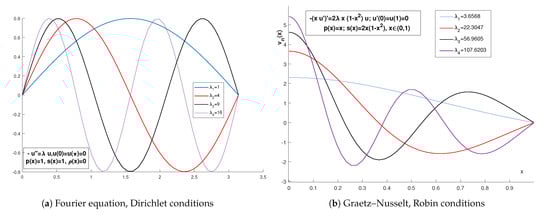 Known equations, such as Fourier, Graetz–Nusslet, Collatz and Airy equations, for which RSL assumptions are verified, are given in Table 1, and the first eigenvalues and eigenfunctions are depicted in Figure 1 and Figure 2.