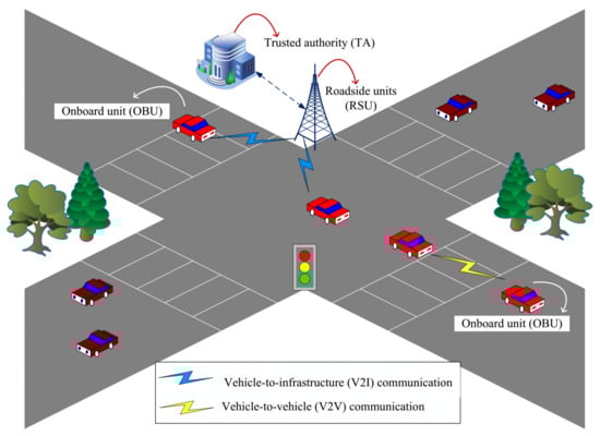Intelligent transportation system (ITS) plays an important role in improving modern life in a digital world. In 2017, the global demand for connected vehicles reached 63,026 million dollars, and an annual growth rate of almost 17.1% is expected for this demand in 2018–2025 to reach 225,158 million dollars in 2025 []. ITS can provide comprehensive and innovative services to improve traffic management in the future. This system builds smart vehicles through wireless communication technology [,]. Vehicles, along with road infrastructure, make a new wireless network known as vehicular ad hoc network (VANET) [,]. The initial purpose of this network was drivers’ safety and comfort in vehicular environments [,,]. However, this view is slowly changing because the network is now used as an infrastructure for the intelligent transportation system and supports vehicles and any activity that require Internet in the smart city ecosystem. VANET is a subset of the mobile ad hoc network (MANET) [,]. It uses wireless technology for providing communication links between vehicles and fixed road infrastructures. In VANET, communications are classified into two groups, including vehicle-to-vehicle (V2V) and vehicle-to-infrastructure (V2I). In V2V communications, each vehicle exchanges traffic information such as road status, accidents, intention to rotate with neighboring vehicles. On the other hand, in V2I communications, the trusted authority (TA) shares road information through a graphical user interface and helps drivers to make an informed decision under special conditions to prevent accidents [,]. Figure 1 shows a vehicular ad hoc network.