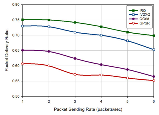 In this section, the proposed method is implemented using the network simulator version 2 (NS2) to evaluate its performance. Note that NS2 is an event-driven simulation tool. It is useful for evaluating the dynamic nature of communication networks. It can be applied for implementing both wired and wireless network protocols such as routing algorithms. For more information, refer to []. Then, IRQ is compared with the three methods, namely IV2XQ [], QGrid [], and GPSR [] in terms of packet delivery rate (PDR), the average end-to-end delay, the average hop count, and routing overhead. In this process, the size of the network environment is equal to 3 km × 3 km. This network includes 38 two-way road segments and 24 intersections. The density of vehicles varies in different road segments so that there are between 5–20 vehicles per kilometer. The total number of vehicles in the network is 450, and the speed of vehicles is equal to 14 m/s. The transmission radius of each vehicle is between 250–300 m, and the transmission radius of each RSU is 300 m. Additionally, the simulation time is 1000 s. The broadcast period of beacon messages is one second, and the traffic message is updated per 5 s. In the simulation process, the packet sending rate is equal to 1–6 packets/s, and the size of each packet is 512 bytes. In the Q-learning algorithm, the learning rate is . In IRQ, the Q-learning algorithm utilizes the -greedy strategy in the exploration and exploitation process. In the simulation process, the probability of is . The simulation parameters are summarized in Table 5.