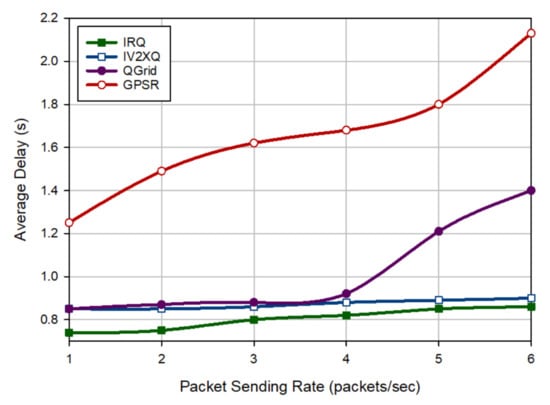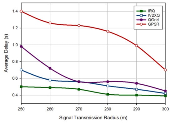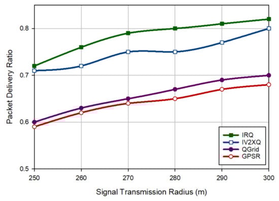 Package delivery rate (PDR) indicates the ratio of all packets received by the destination nodes to all packets sent by the source nodes. Two experiments are performed to evaluate the packet delivery rate. In the first experiment, the relationship between the packet delivery rate (PDR) and the packet sending rate (PSR) is evaluated. It is shown in Figure 4. According to this figure, there is a reverse relationship between PSR and PDR in all the routing methods so that PDR reduces when PSR increases, and vice versa. When the packet sending rate increases, the number of packets produced in the network increases. This rises network load, which fulfills the buffer capacity of vehicles in the network. This leads to packet loss and reduces the packet delivery rate. In the second experiment, the relationship between the packet delivery rate and the signal transmission radius (STR) of vehicles is analyzed. Figure 5 displays that there is a direct relationship between PDR and STR. This means that the packet delivery rate improves when the signal transmission radius of vehicles increases. When STR increases, vehicles can communicate with more vehicles in a wider communication range. As a result, the vehicles can find a more appropriate next-hop node for transferring data packets. This reduces the probability of trapping in the local optimum. According to Figure 4 and Figure 5, IRQ has the best packet delivery rate compared to other routing methods. In Figure 4, IRQ improves PDR by 4.29%, 19.67%, and 25.86% compared to IV2XQ, QGrid, and GPSR, respectively. Moreover, according to Figure 5, IRQ increases the packet delivery rate by 4%, 18.18%, and 21.87% compared to IV2XQ, QGrid, and GPSR, respectively. In IRQ, the best route for sending data packets is selected based on the fresh traffic information. In this scheme, the central server selects the best route between the intersections based on the density of vehicles, the average delay, and the average connection time on the road segments. In addition, the central server can detect and prevent congestion in the network. This improves the packet delivery rate on the network. In IV2XQ, the central server makes its routing decisions only based on the historical traffic information stored in its memory, and this information will never be updated. Moreover, IV2XQ only considers density information on the network to choose the optimal path. In addition, QGrid utilizes a greedy strategy to select the optimal grid and selects the grid with a maximum density as the optimal grid. However, too much density can cause congestion in the network and increase packet loss. GPSR also uses a greedy strategy on the road segments. This strategy can increase the probability of trapping in the local optimum, which leads to packet loss.