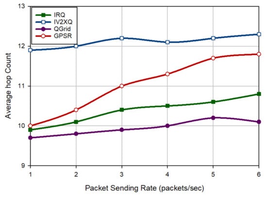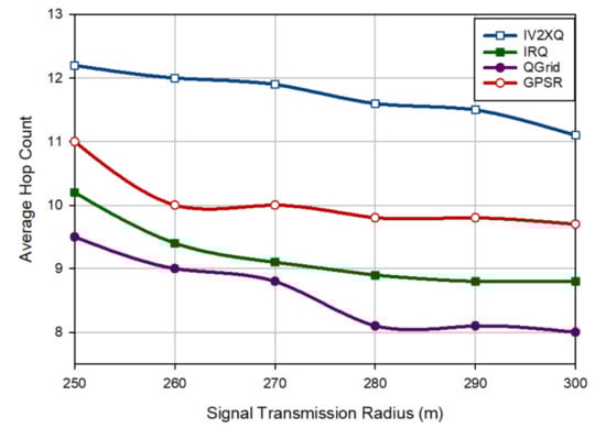 The hop count represents the average intermediate nodes that should be traveled by data packet through the routing path between source node and destination node. Figure 8 shows the average hop counts based on the packet sending rate. According to this figure, the number of hops in the routing paths increases in all routing schemes when increasing PSR because network congestion increases in this case and affects the routing process. IRQ reduces the hop count by 14.35% and 5.89% compared to IV2XQ and GPSR, respectively. However, the performance of IRQ in terms of hop count is weaker than QGrid (approximately 4.32%). In Figure 9, the average hop count is evaluated based on the signal transmission radius. As shown in this figure, there is a reverse relationship between hop count and STR. This means when the signal transmission radius of vehicles is larger, the hop count in a route to reach the destination decreases. IRQ reduces the hop count by 21.50% and 8.46% compared to IV2XQ and GPSR, respectively. However, it has more hop count (almost 7.23%) than QGrid.