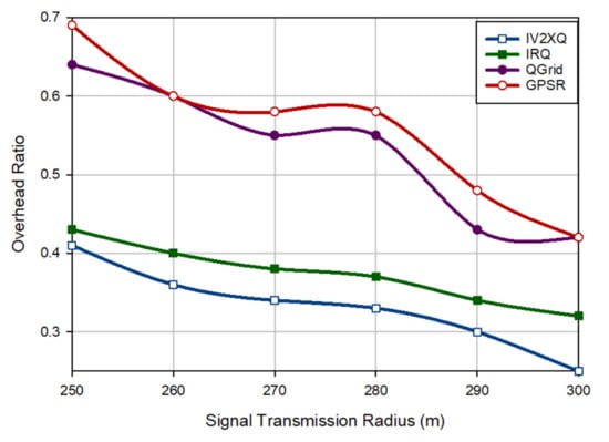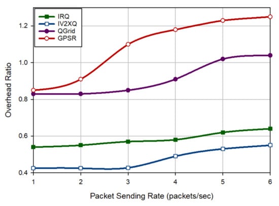 Communication overhead is defined as the ratio of failed data packets in the data transmission process and other packets used for discovering and maintaining routes to all packets produced in the network. Figure 10 displays the communication overhead based on the packet sending rate. Note that the communication overhead increases when the packet sending rate is high. Because when PSR is high, the collision probability will grow due to network congestion. As a result, packet loss has increased, and these packets must be re-transferred. As a result, it is necessary to form new paths on the network. It is associated with high communication overhead. Also in Figure 11, different methods are compared to each other in terms of routing overhead based on STR. As shown in this figure, there is a reverse relationship between routing overhead and STR, meaning that when the transmission radius is larger, the routing overhead reduces. This is rooted in the fact that a large transmission radius improves PDR. It reduces the need for re-transferring data packets, and consequently, lowers routing overhead. According to Figure 10, IRQ reduces the routing overhead by 36.26% and 46.79% compared to QGrid and GPSR, respectively. However, it has more routing overhead than IV2XQ (approximately 23.40%). Moreover, based on Figure 11, IRQ decreases routing overhead by 30.19% and 33.93% compared to QGrid and GPSR, respectively. However, it has more routing overhead than IV2XQ (almost 12.12%). This is because, in IV2XQ, the central server uses only the historical traffic information stored in its memory to discover routes between intersections in the network and does not exchange any control message in this process. As a result, the routing overhead of this method is very low. However, IRQ uses traffic messages to discover routes between intersections in the network. For this reason, the routing overhead of IRQ has increased compared to that of IV2XQ. GPSR also has the worst overhead because it suffers from a local optimum problem. In addition, QGrid has a weak performance in terms of routing overhead compared to IRQ. It is rooted in the lack of a congestion control mechanism. This increases packet loss in the network and increases the need for re-transferring data packets.