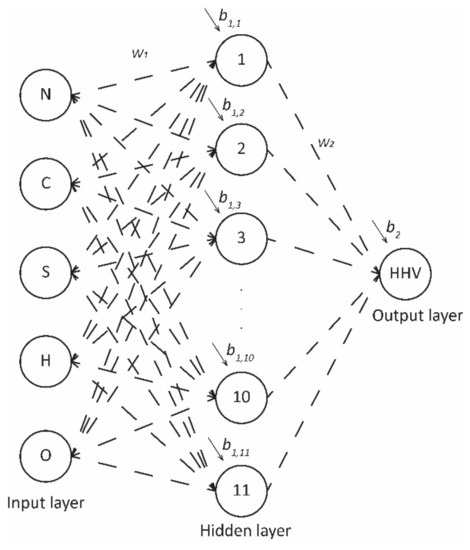 In developing the model ANN, the input variables (N, C, S, H, and O) and the output value (HHV) had to be determined. The weights and biases were determined randomly by looking for values that would make the model accurate enough to predict the output.