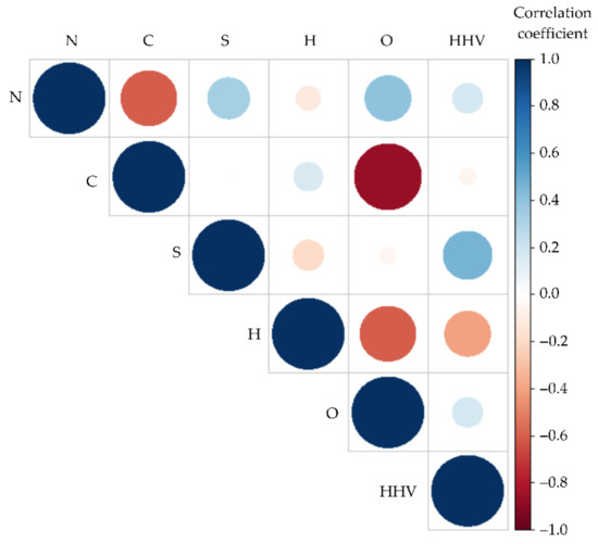 The diagram of the correlation matrix shows the correlation coefficients between the variables. Positive values of the correlation coefficient are shown in blue, while negative values are shown in red. The intensity of the color in the circle is proportional to the correlation coefficient. In Figure 2, it can be observed that the elements O, S, and N are positively correlated with the value of HHV, while C and H are negative. It can be seen that variable S has the highest positive correlation coefficient, i.e., a significant influence on HHV, while variables N and O also have positively correlated values, but less influence on HHV. The variable H in the correlation graph shown has a negative correlation value on HHV. Based on Figure 2, HHV is best correlated with the concentrations of H, S, and N (when the blue color is shown, it is a positive correlation).