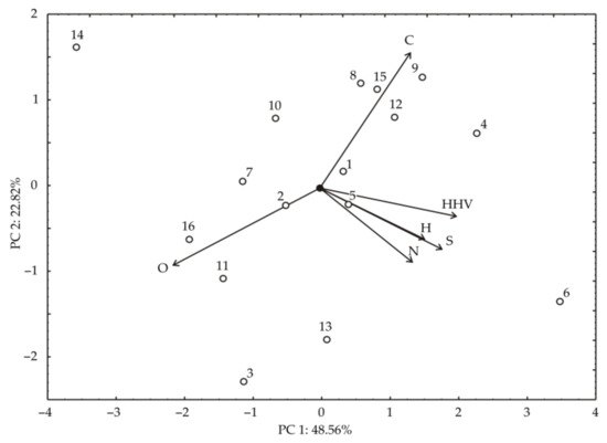 Principal Component Analysis (PCA) is used in the search for orthogonal directions of greatest dispersion of given data with the task of finding patterns in the distribution of individual data with respect to the original data defined in a space with multiple dimensions [33]. The analysis is also used to build predictive models, and it is easy to interpret the impact of individual variables on a given value. In Figure 3, the right side of the diagram shows sample 6, which is significant and has the highest values for HHV, H, N, and S. The upper part of the diagram shows samples 9, 8, 12, 15, 4 with the highest content of C. On the left side of the diagram are samples 14, 16, 11, 3, which have the highest content of O. According to the PCA analysis, the parameters N, S, H and HHV have the greatest influence on the data.