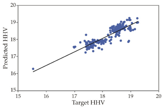 Scatterplot is one of the most common visualization techniques, and displays and displays the behavior of the entered data [35,36]. Figure 4. shows the data of the predicted HHV versus the target HHV, which largely shows the overlap.