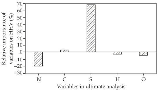 The range in which the relevance factor is determined is between −1 and +1. The increase of HHV is mainly influenced by the increase of the parameter S. The influence of input variables was studied according to Yoon’s interpretation method for parameters N, C, S, H, O. In Figure 5 is the influence of variables N (−20.64%), C (3.13%), S (68.89%), H (−3.07%), and O (−4.27%) on the target value of HHV. In Figure 5, it can be seen that the parameters C and S have positive values of relative importance for the variable HHV, while the values of N, H, and O have a negative influence and are not factors of relative importance in determining the value of HHV. Looking at the calculation of the input data carried out according to Yoon’s method of interpretation based on the ultimate analysis the positive variable S have the greatest influence on the determination of the output values of HHV.