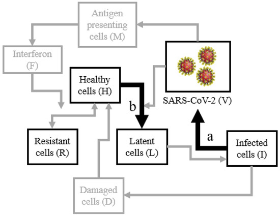 The within-host SARS-CoV-2 viral model is probed with potential therapeutic interventions. The effect of widely used Remdesivir, a monophosphoroamidate prodrug that is utilized to inhibit the viral transcription rate, is modeled by controlling the parameter associated with viral replication. The potential use of host-cell inhibitors is modeled by controlling the parameters that inhibit the virus’s ability to catalyze the transformation of healthy cells to latent cells. A summary of the key viral interactions in the within-host model, first described by Sadria and Layton [18], is given in Figure 1.