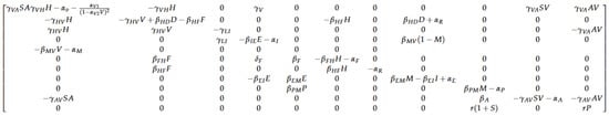 In order to discuss the stability of the solutions under the conditions prescribed in Section 2, a linear stability analysis [22,23,24] is performed. Let the system of differential Equations (1)–(11) be represented by . The model is evaluated at equilibrium, where . Small perturbations are introduced around such equilibrium and variables are replaced where . Thus, is approximated by . This implies