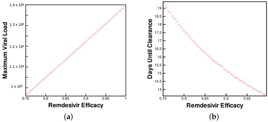 (a) Maximum viral load and (b) time until viral clearance observed by patients for varying levels of Remdesivir treatment.