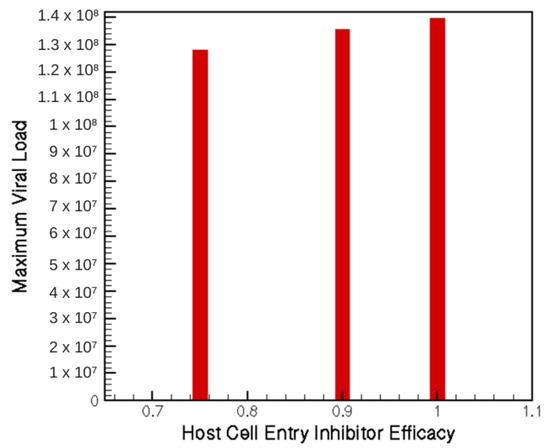 Maximum viral load for three potential levels of host-cell entry inhibition treatment.