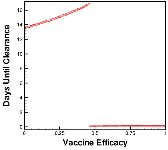 Days until clearance for levels of vaccine efficacy from no immunity (0) to natural antibody levels of immunity (1).