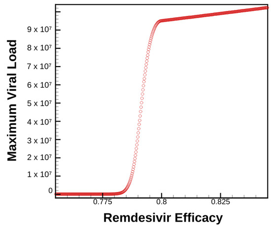 First, the dependence of maximum viral load on treatment efficacy is examined. Remdesivir treatment efficacy of —decreasing the viral transcription rate by 90%—corresponds to the efficacy of about M Remdesivir [8]. Efficacy is varied around this value from to in steps of .