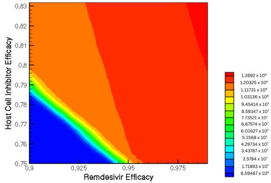 Contour plot shows the viral load as a function of Remdesivir and host-cell entry inhibition combination therapy.