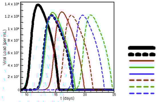 Finally, the results of various timed treatment combinations in key vaccination efficacy regimes are explored to highlight the differing outcomes. In other words, depending on patient predisposition, the “best” treatment—in terms of maximum viral load—is not always the same treatment timing and combination choice. This is most apparent in Figure 11, where identical treatment regimes are tested for various vaccination efficacies, and the mixed results for producing maximum viral load are reported.