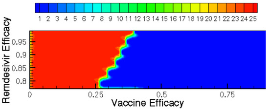 Time until clearance (days) displayed as a contour function of vaccine and Remdesivir efficacy.