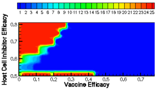 Many important conclusions can be drawn from Figure 9 and Figure 10. First, the introduction of treatment greatly affects the range of efficacy by which vaccines produce near-instantaneous clearance. The apparently step-wise phase transition dependency on treatment dosage offers insight into the level of treatment needed for a patient depending on time since vaccination.