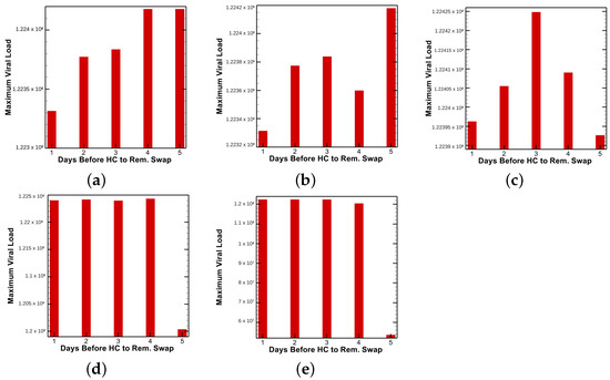 Maximum viral load observed for various treatment timing configuration of host-cell entry inhibitor followed by Remdesivir with patient vaccine efficacies of (a) 0.1, (b) 0.125, (c) 0.150, (d) 0.1625 and (e) 0.175.