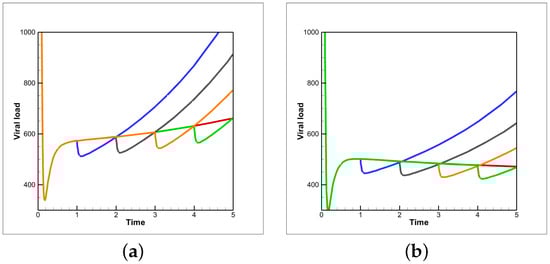 Viral load as a function of time for various treatment timing configurations of host-cell entry inhibitor followed by Remdesivir with patient vaccine efficacies of (a) 0.1 and (b) 0.15. Colored lines describethe time before the entry-inhibitor to Remdesivir therapy swap. Blue, black, orange, green and red correspond to one, two, three, four and five days, respectively.