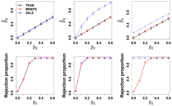 (Top) panel: comparison of estimators obtained via MREPS and 2SLS under the random (left), EPSY (middle) and EPSX (right) designs. (Bottom) panel: rejection proportion of comparison for MREPS and 2SLS under the random (left), EPSY (middle) and EPSX (right) designs.