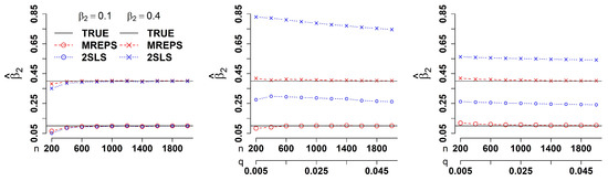 Figure 2 displays the behavior of the estimator due to the change of the subsample size n or due to the change of the corresponding quantile value q under EPSX and EPSY. Under the considered simulation setting, for the random subsample, is an ideal sample size, and there is not much gain for other large sample sizes, indicating the consistency property is achieved. Both 2SLS and MREPS procedures produced roughly the same estimators. For both EPSX and EPSY, the ideal optimal sample size can be as small as 200 (100 in both tails) under MREPS, and there is not any substantial gain for the larger sample sizes. However, regardless of the increment of the sample size n, 2SLS consistently produced nearly the same bias, indicating that 2SLS fails to recover the tradeoff loss due to the subsample selection under EPSX and EPSY.