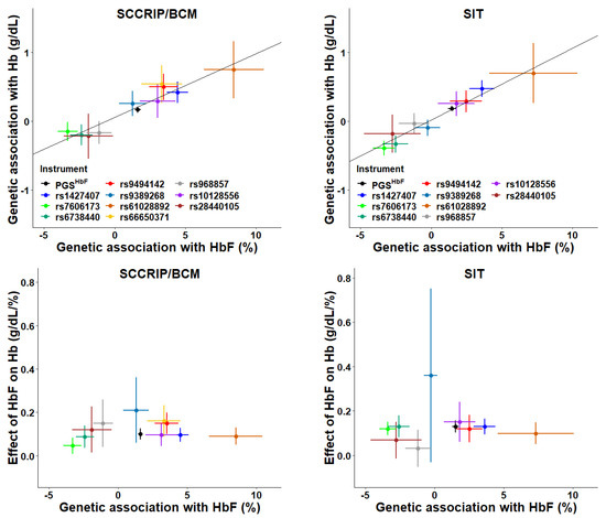 MR analyses to assessing the causal effect of HbF on Hb of patients from the two cohorts of SCCRIP/BCM and SIT. Instrumental variables are PGSHbF and .