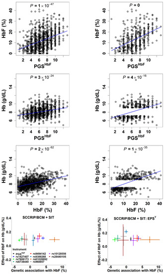 SIT validation findings: To validate the findings from the entire cohort analysis from SCCRIP/BCM, we analyzed SIT data as an entire group. We first confirmed the relationships among HbF, HB and PGSHbF (see Supplementary Figure S1). There were no relations between PGSHbF and any potential confounding factor, including age, sex, SS/S, and 5 PCs based on the Spearman correlation analysis and the two-sample Wilcoxon rank sum test. When we included both HbF and PGSHbF in the same model, both PGSHbF and HbF were significantly associated with Hb although the variance in Hb explained by HbF was 3.5 times higher than that by PGSHbF (14% vs. 4%).