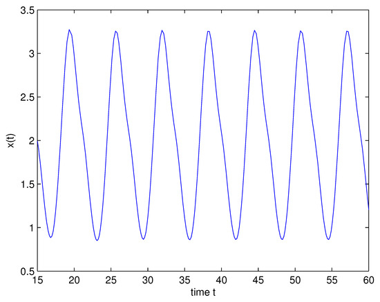 where and It is easy to verify that the conditions of Theorem 5 are satisfied with and . Thus, Equation (10) has at least one positive -periodic solution. The corresponding numerical simulation is presented in Figure 1.
