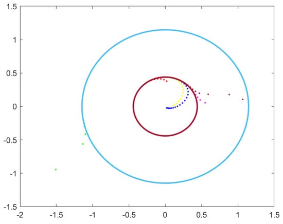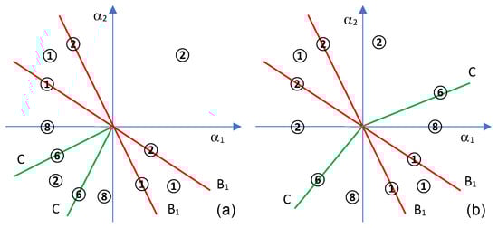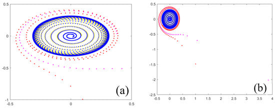 In [4], the bifurcation diagrams were discovered in a general case, where the functions and both have linear terms different from zero that satisfy the degeneracy condition or see (1). In that case, 32 bifurcation diagrams were obtained. A parallel approach to that of [4] is studied in [35] by using another regular transformation of parameters, where the product In the article [15], the functions and have , obtaining four bifurcation diagrams. Ref. [10] studied the case when and or and , obtaining 18 different bifurcation diagrams. The stability of the fixed point O for that is sufficiently small and, respectively, “the existence of closed invariant curves in the” [4] truncated normal form in all the cases was treated before [10,15,35].