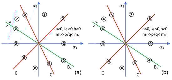 Considering the possible sub-cases of I, III, and IV, depending on the signs of , one remarks that the numbers of sub-cases is halved by condition (1) of Theorem 2.