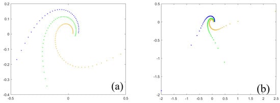 Corresponding to the studies we previously carried out [4,15], the following phase portraits are highlighted below. In this case, the phase portraits for the curves of bifurcation when are shown in Figure A1."