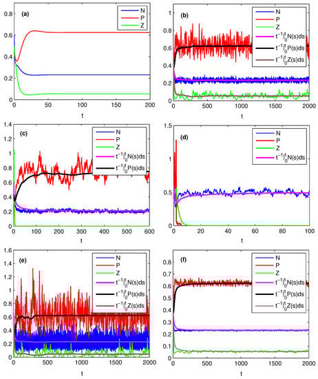 Effects of noise on the dynamics of model (4) for , , , , , , , , , . (a) , then , and which is asymptotically stable; (b) , , then , i.e., the entire system is persistent; (c) , , , then and , i.e., the phytoplankton is stable in mean and the zooplankton goes extinct; (d) , , , then , i.e., both phytoplankton and zooplankton go extinct; (e) , , , then ; (f) , then .
