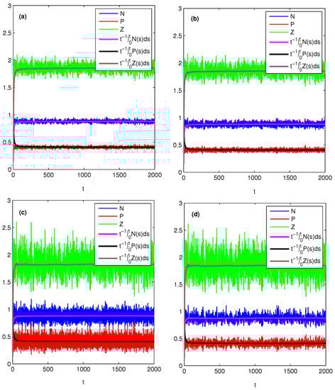 From Theorem 2, it is easy to see that the persistent level of nutrient or zooplankton depends on the effects of environmental noise on both phytoplankton and zooplankton, while the persistent level of phytoplankton only depends on the effect of environmental noise on zooplankton. Assuming and noting that the expression of in Theorem 2, phytoplankton will persist better when increasing . This is because zooplankton feeds on phytoplankton, and with the increasing of , zooplankton tends to become extinct, so phytoplankton can grow vigorously. For the effects of and on nutrient and zooplankton, we can analyze similarly. Next let us give some numerical simulations with different , and to verify these findings, see Figure 2. Comparing Figure 2a with Figure 2b, we see easily that the persistent levels of nutrient and plankton do not change with the increasing of . Comparing Figure 2a with Figure 2c, one can see that with the increasing of , the persistent level of nutrient increases, while the persistent level of zooplankton decreases. More interestingly, the persistent level of phytoplankton does not change. Comparing Figure 2a with Figure 2d we can obtain that with the increasing of , the persistent levels of nutrient and zooplankton decrease, while the persistent level of phytoplankton increases.