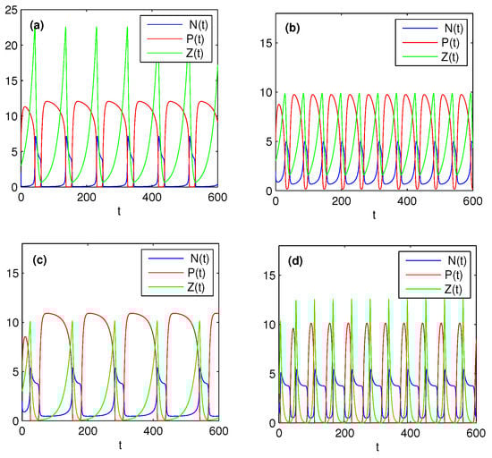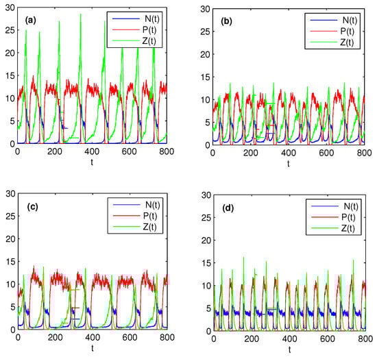 Now we select several parameters as in Figure 3 satisfying condition (38), which ensures system (37) without stochastic perturbations is persistent. Figure 4 shows that the effects of different k, and on the dynamics of model (37) under stochastic perturbations. From Figure 3 and Figure 4, it is not difficult to find that stochastic system (37) under small perturbations preserves the properties of the solutions of its corresponding deterministic system, which has been illustrated in Section 4.1. Comparing Figure 4a with Figure 4b, we further observed that increasing the half saturation constant k of the nutrient uptake function can significantly decrease the peak and period of the algae outbreak. These conclusions are contrary if we increase , see Figure 4b,c. Finally, comparing Figure 4c with Figure 4d, it is easy to see that increasing the fraction of zooplankton nutrient conversion may increase the frequency of algae blooms. All these numerical observations show that nutrient uptake functions and zooplankton nutrient conversion rate play an important role in the periodic oscillatory succession of bloom and greatly affect the interactions between nutrients and plankton.