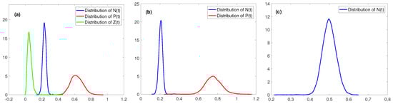 The distributions of , and , where all parameters in (a–c) are the same with these in Figure 1b–d, respectively.