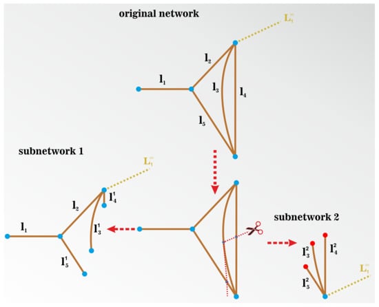 The original network (graph) is split into two disconnected subnetworks (subgraphs) , , at the common for the subnetworks (subgraphs) edges . All networks possess vertices with the standard boundary conditions. The schemes of the networks and its two subnetworks and are schematically shown in Figure 1. In this case, all Dirichlet boundary conditions (red dots) in are changed to the Neumann ones. The standard (Neumann) boundary conditions are denoted in Figure 1 by blue dots.
