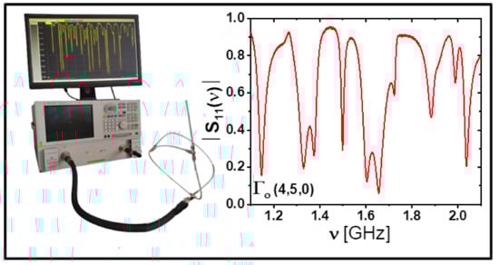 The generalized Euler characteristic defined by Equation (6) was evaluated experimentally by measuring the spectra of microwave networks simulating quantum graphs. Figure 2 shows the experimental set-up which includes an Agilent E8364B vector network analyzer (Agilent, Santa Clara, CA, USA) and HP 85133-60017 flexible microwave cable (Agilent, Santa Clara, CA, USA) that connects the investigated network to VNA. A cable HP 85133-60017 connected to the network is formally equivalent to an infinite lead, which is attached to the quantum graph [15,22]. Using this set-up, the one-port scattering matrices of the networks were measured as a function of frequency . The modulus of scattering matrix was used to identify networks’ resonances. In Figure 2, we present also the original microwave network which possesses four vertices with the Neumann boundary conditions. As an example of the measured spectra, the spectrum of the network is shown in the inset of Figure 2 in the frequency range GHz.