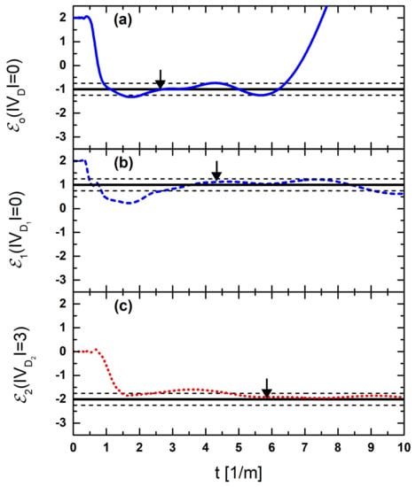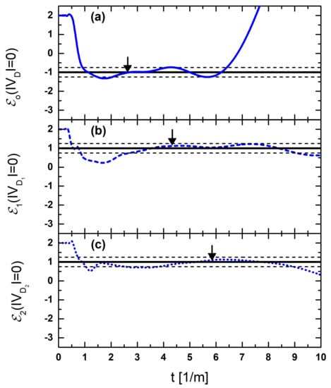 Generalized Euler characteristics calculated for the networks with the standard boundary conditions as a function of the parameter t. Panels (a–c) show the generalized Euler characteristics (blue full line), (blue dashed line), and (blue dotted line) of the networks , , and , respectively. The plateaux at the plots of the generalized Euler characteristics shown in panels (a–c) start close to the points m, m, and m, respectively, which are marked by the arrows. The black broken lines show the limits of the assumed maximum errors , , and .