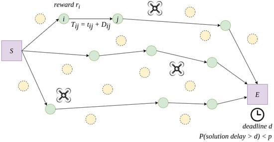 The team orienteering problem (TOP) has been used to model operational challenges related to unmanned aerial vehicles (UAVs) [] as well as road electric vehicles and ride-sharing mobility actions in smart cities []. In this paper, we tackle the team orienteering problem with probabilistic delays (TOP-PD). As illustrated in Figure 1, we consider the realistic situation in which travel times between any pair of nodes i and j () in a set V might be subject to uncertainty due to the existence of a random delay . Using historical data, it will be assumed that we have been able to model each by a best-fit probability distribution. Thus, is composed of the minimum time required to travel from node i to node j () under ideal circumstances (e.g., no traffic jams, excellent weather conditions, etc.) which will be positive and a . In our TOP-PD, a fixed fleet of vehicles departs from a common origin location and has to reach a common finish location on or before a given deadline d strictly greater than the maximum of the expected values of , . Vehicles can visit some of the available nodes in V along their trip, thus collecting the corresponding reward. Thus, a reward is obtained the first time node is visited by any vehicle (notice that re-visiting a node does not provides any further reward; hence, it only makes sense to include a node in at most one route). Therefore, our main goal is to maximize the total reward collected by the fleet. However, while designing our routing plans, we will also need to guarantee a certain reliability level, i.e., the proposed solution is required to have a low probability of suffering delays under a user-specified threshold, p. This probabilistic constraint, which might appear in many real-life applications, introduces noticeable challenges in the optimization problem.