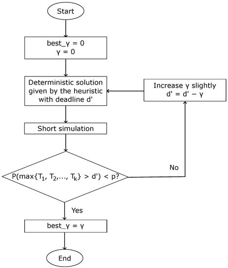 - If after a short simulation the probability of the solution incurring in a delay is greater than p, we will slightly increase . Therefore, the new deadline taken to construct the solutions will be , with and . Note that when a is found such that , it will be saved (), so the future solutions created by the algorithm will have deadline .