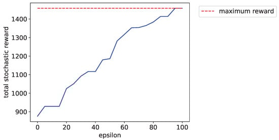 Algorithm 2 provides an example of how a ‘promising’ solution could be evaluated under a stochastic scenario to compute the expected reward collected by the fleet of vehicles. First, the function initializes the auxiliary variables to compute the expected profit of the solution totalProfit. Then, the simulation runs are performed. Notice that the number of runs is an input parameter defined by the user. For each run, the function computes the time to complete each route of the solution, as well as its associated expected profit. Thus, the expected travel time is a summation of the deterministic travel time () to cross an edge and an estimated travel delay (), which is a random value according to the corresponding probability distribution. This result is accumulated into the route travel time. Notice that under stochastic travel times, the routes’ duration might be long enough to exceed the deadline, therefore incurring certain delay. Since we are interested in avoiding this behavior, every time a route exceeds the deadline we will force it to lose all of its profit. This way, the algorithm will prioritize solutions that are not that likely to experience delays, since after the simulation they will obtain a smaller reward and therefore be excluded. Back in Algorithm 2, the average reward is computed and stored. Rabe et al. [] offer a discussion on how more advanced simheuristic algorithms can be designed.