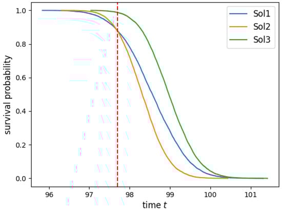 In order to choose a solution from the elite group of solutions, a survival function of each routing plan is obtained. To build this function, it was necessary to obtain the Kaplan-Meier estimator from the simulation outcome. The survival function offers the probability of incurring delays of different solutions or routing plans. In this way, we can compare different routing plans both in terms of the expected reward and the probability that they will finish for a certain target moment. For our analysis, we will focus on the top 3 solutions that our approach generated for instance p7.4.t. Figure 5 represents the Kaplan–Meier survival curves associated with each of the top 3 stochastic solutions obtained for the same expected reward. Note that clearly underperforms both and at any target time. On the other hand, outperforms until . At this point, both curves meet, having around survival probability (or probability that the routing plans can finish on or before the target time). After this moment, is the one whose curve falls faster, meaning that the probability of its routing plan being finished is smaller than the other two solutions.
