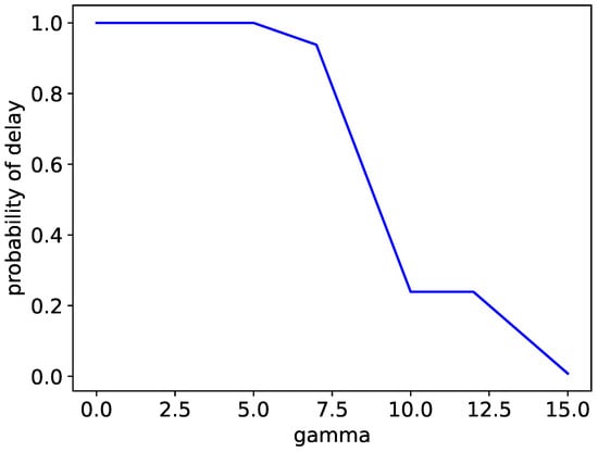 In this subsection, we will implement the probability constraint that will allow the solutions to have a low probability of suffering delays for a soft deadline , under a user-specified threshold p. If represents the total time invested by vehicle in completing its assigned route, then where and . For the sake of simplifying the experimentation process, we will consider . Nevertheless, the decision maker can choose any . Figure 6 shows the trade-off between gamma and the probability of delay for the instance p7.4.t with time units. When gamma increases, limiting the routes’ maximum duration, the probability of delay decreases, reaching a value close to 0 when we allow routes to have a maximum duration of 85 (). If, for example, the decision maker states that only solutions with a probability of delay under are allowed, then the algorithm will set , allowing routes to have a duration of only 90 time units.