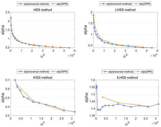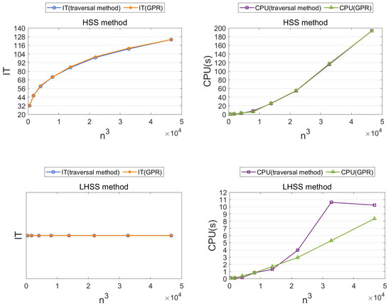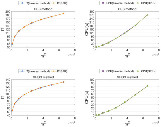 The GPR method vs. the traversal method. We first use the HSS method and the MHSS method to solve Equation (14) and the splitting parameters are selected using the traversal method and the GPR method, respectively. Table 10 and Table 11 and Figure 5 show the numerical results.