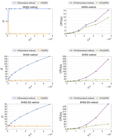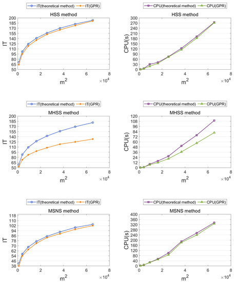 The IT and CPU of the HSS method, the MHSS method and the MSNS method to solve Equation (14) with splitting parameters selected by the theoretical method and the GPR method, respectively.
